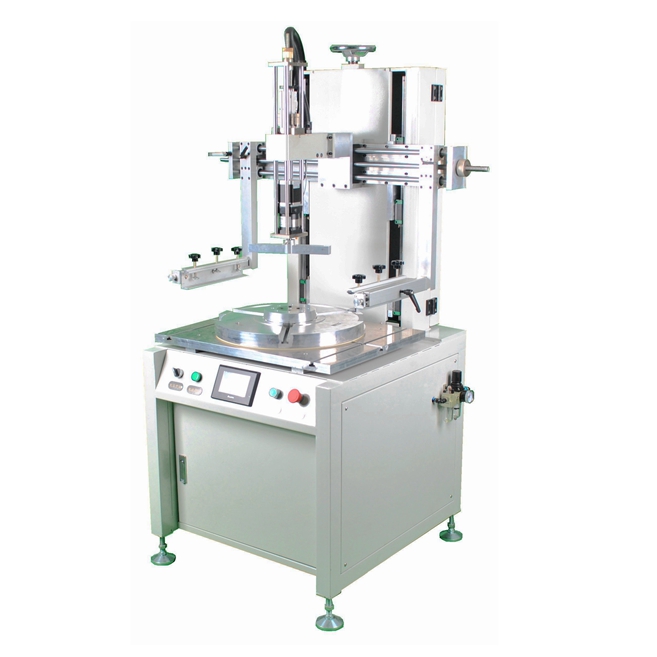 針對(duì)印刷面下凹的圓盤形產(chǎn)品,普通的絲印機(jī)平移運(yùn)動(dòng)的刮刀無(wú)法完成印刷。